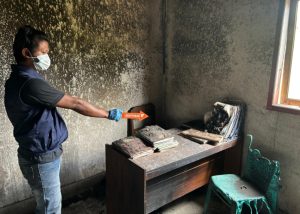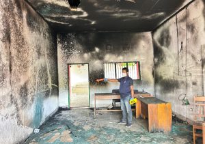 Ada juga ditemukan bekas cungkilan benda keras pada jendela ruang Kepala Seksi Pemerintahan yang menyebabkan kerusakan pada grandel jendela, temuan serupa juga ditemukan pada jendela ruang Sekretaris Desa. Selain itu, di dalam ruangan tengah ditemukan sisa pembakaran tumpukan kursi plastik serta abu pembakaran berkas yang tersebar di setiap sudut ruangan.” Papar Kaur Identifikasi dilokasi