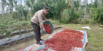 Donggala – Tribratanews.sulteng.polri.go.id Kapolres Donggala AKBP Efos Satria Wisnuwardhana,S.I.K.,M.I.K melalui Kapolsek Damsol Iptu Yeri M Mawentiwalo bersama personil Polsek Damsol dan Warga melakukan panen cabai keriting. Rabu (8/2/23). Saat di konfirmasi Adapun pelaksanaan giatnya kemarin tanggal, Selasa (7/2/23). Bertempat di desa Budimukti Kec.Dampelas Kab.Donggala. ” Jenis cabai keriting tersebut ditanam di kebun milik salah satu personil Polsek Damsol yakni Briptu Ardi Aswar Bhabinkamtibmas Desa Budimukti, yang digarap bersama masyarakat setempat yang ia garap sekitar bulan November tahun 2022 dan telah panen pada Februari 2023″. “Jadi Ini semua sekitar 4 bulan jangka waktunya kita sudah dapat memetik hasilnya, dan ini bisa panen sampai 7 kali”. Ucap Kapolsek Dilain tempat Kapolres Donggala mengapresiasi kinerja Kapolsek Damsol bersama Personilnya yang mendorong masyarakat untuk lebih giat mengembangkan sektor pertanian demi kemajuan ekonomi mandiri akibat dampak inflasi. “Saya bangga dan salut kepada seluruh personil Polsek di jajaran, Dimana melihat peluang memanfaatkan lahan kosong dengan membudidayakan tanaman cabai serta merangkul masyarakat untuk sama sama bersinergi dalam hal ketahanan pangan,” ujar Kapolres. Diharapkan lahan yang telah dimanfaatkan untuk menanam cabai sekaligus memanen ini, bisa menjadi pilot project atau percontohan bagi polsek- polsek lain di wilayah hukum Polres Donggala. ” Tambah Kapolres “Ini sangat bagus. Saya harap seluruh polsek yang ada bisa melakukan hal yang sama. Bila perlu buat lebih baik lagi. Sehingga pelayanan kepada masyarakat saling bersinergi dengan baik,” pintanya. Polres Donggala (As / Hms)